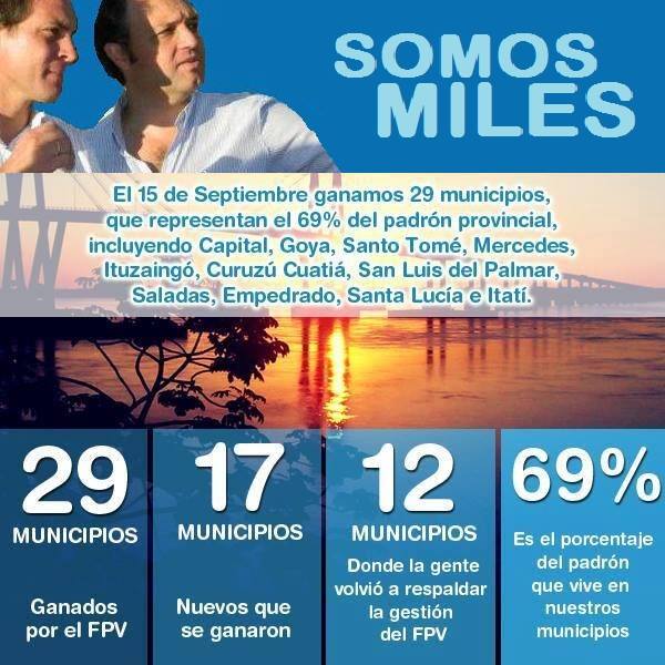 También comenzó a difundir un afiche donde muestra en números lo logrado por el FPV las pasadas elecciones, en relación a la cantidad de comunas ganadas, y haciendo hincapié en la figura de Camau Espínola. “Con la fuerza de Camau. Con la fuerza de Corrientes. Carlos Rubín diputado nacional”, aseguró el candidato.