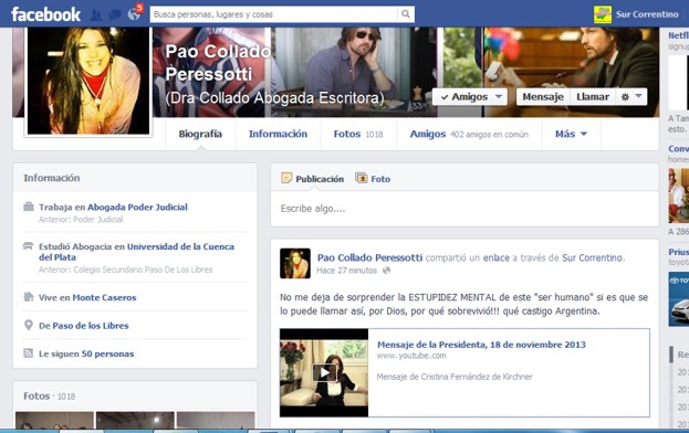 Paso de los Libres (18-11-13): A poco de colocar en el facebook de SUR CORRENTINO el video de la presidenta Cristina Fernandez en donde agradecía a los argentinos por las muestras de apoyo, anunciando su vuelta a sus funciones luego de su convalecencia, nuevamente el odio irracional, la estupidez humana, esta suerte de locura opositora, muestra el costado más vil de las personas y ese venemo que carcome las conciencias. Una joven abogada, funcionaria del Poder Judicial en Monte Caseros, la Dra. Pao Collado Peresotti, demostraba su falta de imparcialidad para cumplir sus funciones al desear la muerte de la presidenta, hecho que configura delito, pero la impunidad del odio pudo mas que su racionalidad. Al ser publicas sus declaraciones en el Facebook me permiten poner su nombre.