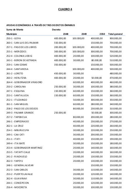 Además está el caso de los 3 decretos ómnibus del 26 de Septiembre, donde los municipios beneficiarios figuran en un anexo, de manera que no figuren en el Boletín Oficial. No existe fundamentación de los mismos ni tampoco el motivo por el cual un municipio recibe 3 ayudas económicas de manera sucesiva en decretos consecutivos sin que exista diferenciación aparente en el objeto de las mismas. Cabe hacer notar que a pesar de ser consecutivos y firmados en el mismo día fueron publicados en boletines oficiales diferentes (Cuadro 4).