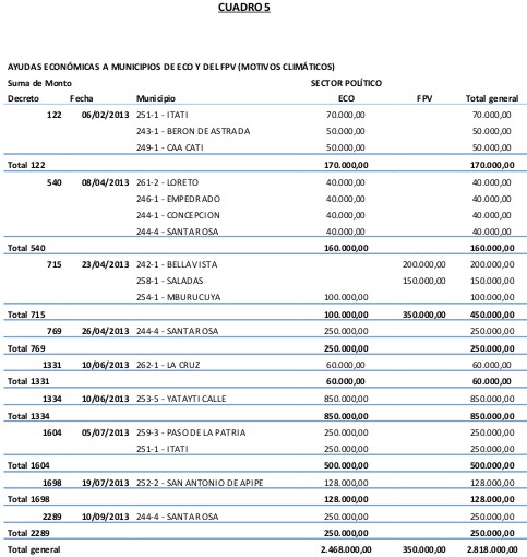 De los decretos de apoyo económico, 9 fueron por razones climáticas por un total de $2.818.000,00. Aparentemente un solo día llovió en algún municipio del Frente para la Victoria, aunque hubiera habido grandes pérdidas en municipios vecinos (Cuadro 5).