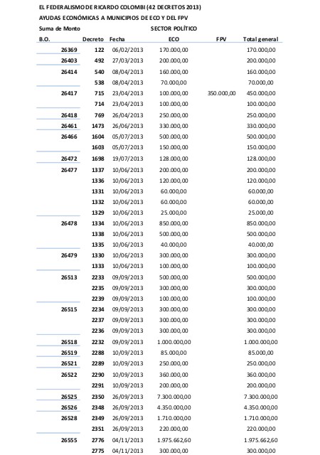 El informe se sustenta en el análisis de 42 decretos mediante los que se otorgaron 162 ayudas económicas a 52 municipios durante el ejercicio 2013 por un total de $ 25.508.663,00 (Cuadro 1).
