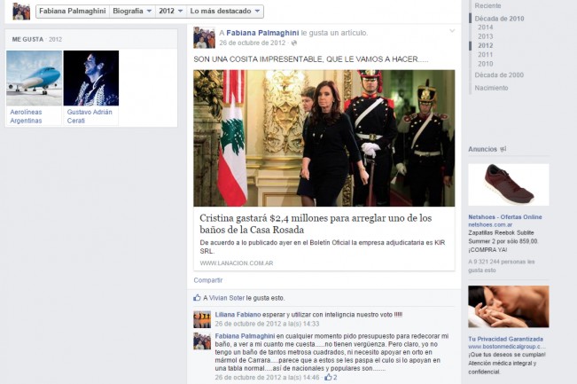 Bs. As. (20-1-15): Después de enterarse de que quedaría a cargo de la causa, la magistrada Fabiana Emma Palmaghini eliminó de su cuenta personal de Facebook distintos comentarios e insultos contra la Presidenta y el gobierno nacional.