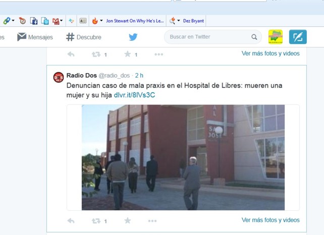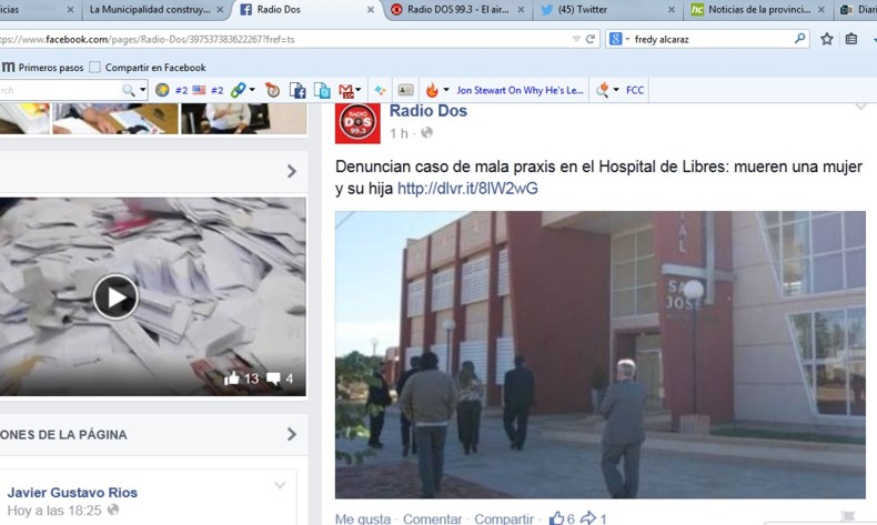Hasta ahí todo bien, a los poco minutos trato de ingresar a la nota reflejada en el portal RADIO DOS para ver si estaba el audio de la nota y con sorpresa noto que la nota ya no estaba más y no era porque ya había superado el tiempo y otras las van empujando hacia abajo, busco en el buscador de la página y nada, muy extrañado por el hecho ingreso en las cuentas de las redes sociales de la emisora y noto con sorpresa que estaban las fotos del Hospital san José, el Título de la nota y el link para redireccionar a la página, pero al entrar nos dirige hacia una página en blanco, lo que demuestra que la nota ni siquiera se levantó, sino que la borraron.