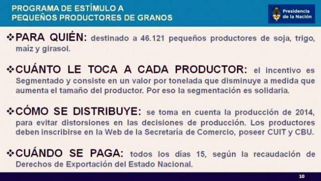 El ministro afirmó que el incentivo “se va a pagar según el momento en que se vaya liquidando la cosecha al exterior, que es cuando el Gobierno recauda las retenciones”, y enfatizó que por ese motivo “se llama la atención sobre la especulación de los comercializadores de granos que van a privar de recursos a los beneficiarios de este fondo”.