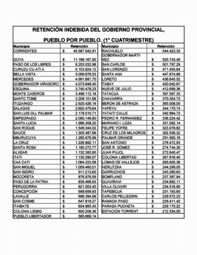 Corrientes (13-5-15): Trascendio el listado de los dineros que el gobierno de Ricardo Colombi retiene a los municipios, los fondos remitidos por la Nación correspondiente al Fondo Educativo deben ser remitidos a las comunas pero el gobierno se niega a hacerlo, de esta manera adeuda a la capital correntina más de $45 millones, a Goya $ 11 millones, a Paso de los Libres más de $ 6 millones, entre otras localidades.