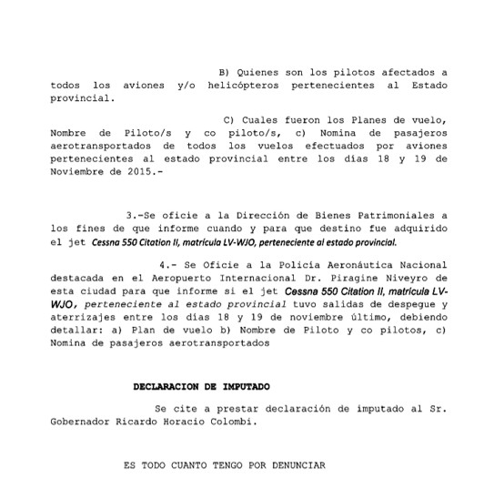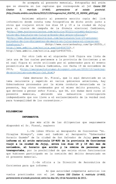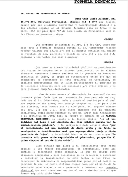 La denuncia fue presentada por el diputado Raúl Alfonso ante el Fiscal de instrucción de turno. En otros párrafos destacados el texto de la denuncia sostiene que funcionarios, entre los que se encontraba el gobernador “se trasladó aparentemente con un avión perteneciente al gobierno de la provincia adquirido para uso sanitario y/o avión oficial y no para promover campañas electorales”.