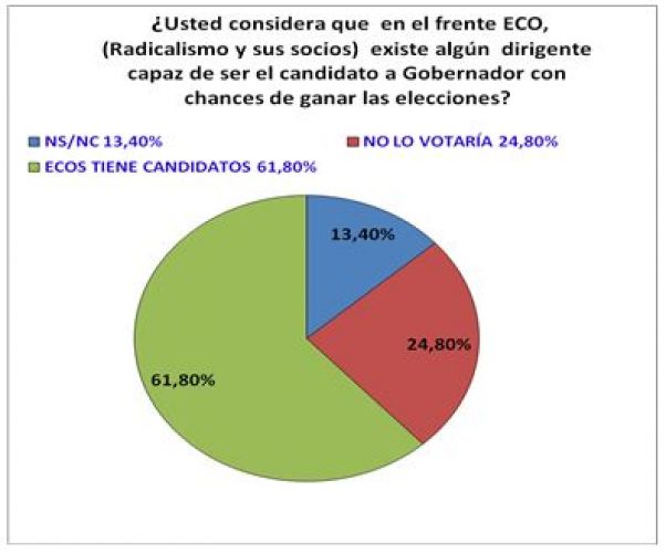 El resultado obtenido es concluyente y propicia varias lecturas sobre los motivos -más profundos- de la iniciativa oficial. Así pues surge que el 61,80% de los consultados sostiene que ECO tiene dirigentes capaces de ser candidatos a gobernador; por el contrario un 24,80% opina en forma negativa (que no tiene dirigentes capaces de ser candidatos), mientras el 13,40% no sabe, no contesta. Es importante tener presente que esta parte de la encuesta se centró en el público que reconoció haber votado por la alianza oficialista que comanda el radicalismo. El trabajo de la Fundación Prometeo (una ONG que indaga fenómenos sociales y políticos) se realizó en esta Capital y abarcó un universo de 580 personas de 30 barrios.