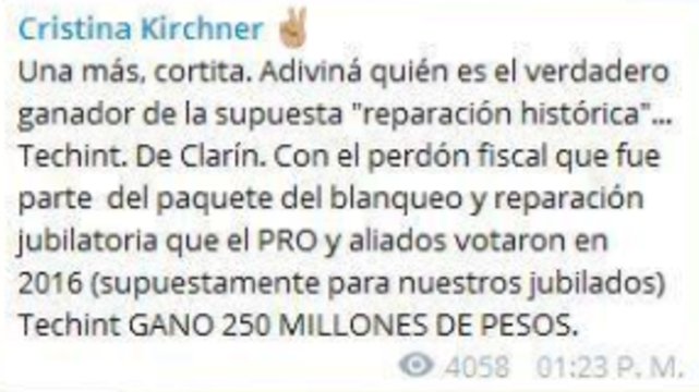 Bs. As. . (21-5-17): La ex presidenta escribió un mensaje en sus redes sociales donde denuncia que la reparación histórica aprobada por el PRO y sus aliados contenía una cláusula que le perdonó impuestos a Techint de Clarín por 250 millones de pesos.