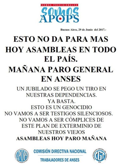 Mar del Plata (29-6-17): El suicidio de un hombre de 91 años en una delegación del organismo previsional, motiva un paro nacional para el viernes y una fuerte declaración contra el Gobierno, cuyas políticas califican como "genocidio" y "exterminio".