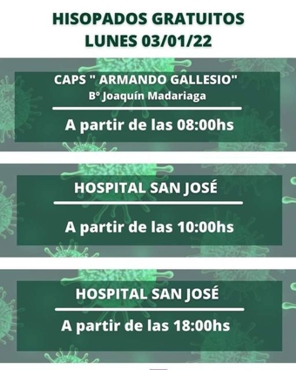 Paso de los Libres (2-1-22): El trabajo preventivo conjunto se realizará de 10:00 a 12:00 hs en la Secretaría de Salud del Municipio, en el Hospital San José y frente al Cuartel de Bomberos Voluntarios en B° INVICO. La Resolución N°443/21 del Ejecutivo Comunal suspendió “por el término de siete días los eventos y espectáculos masivos”, definió mayores controles sanitarios y la aplicación de protocolos sanitarios a las actividades habilitadas. Nuevamente se ve la intencionalidad política de las autoridades sanitarias provinciales ya que contrariamente al anuncio efectuado por la comuna libreña en donde anuncia los testeos en forma conjunta, el Hospital San José solamente anuncia los testeos en el nosocomio y un CAPS provincial, con una clara y maliciosa intencionalidad.