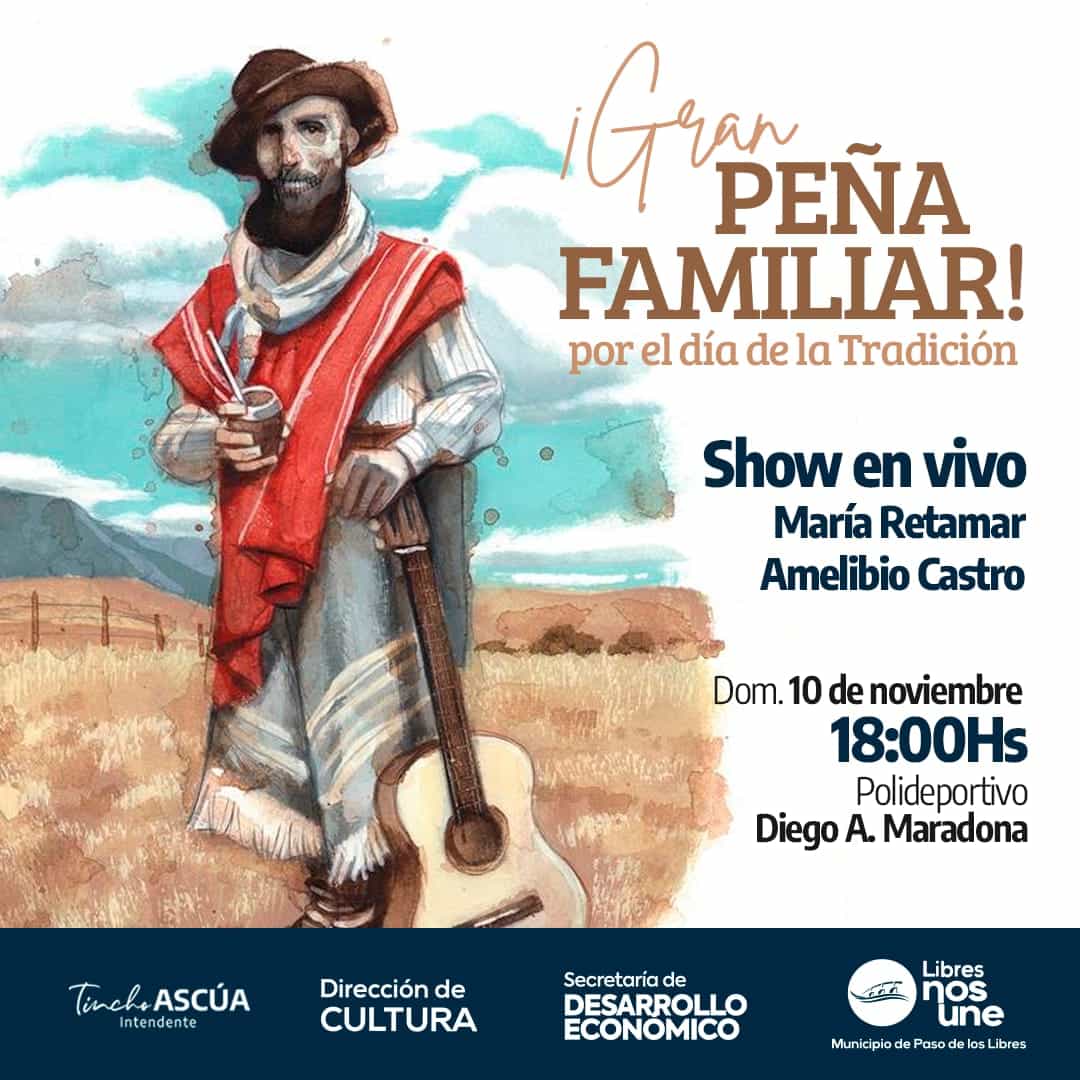 Paso de los Libres (6-11-24): Este domingo 10 de noviembre, a las 18:00 horas, el Polideportivo Diego Armando Maradona de Paso de los Libres será el escenario de una gran peña familiar en honor al Día de la Tradición. Con entrada libre y gratuita, la celebración promete una tarde llena de música, baile y cultura para todas las edades.