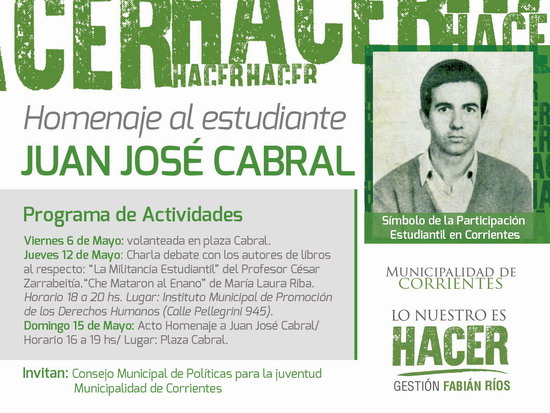 Provinciales | Corrientes (3-5-16): Desde el viernes, con distintas actividades de difusión y de información específica sobre lo ocurrido en mayo de 1969, la Municipalidad de Corrientes, recordará el 47 Aniversario del a...