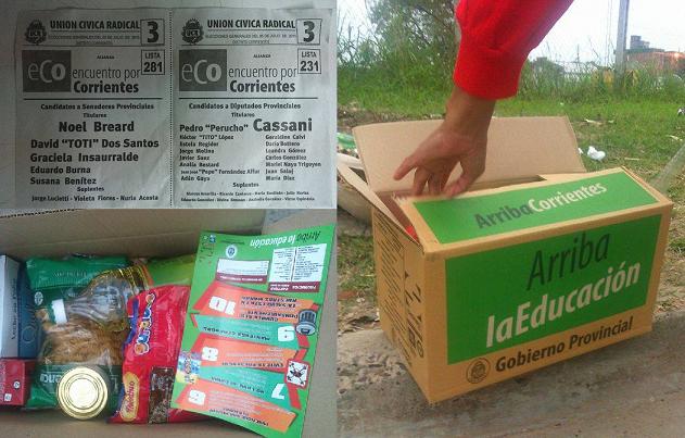 Provinciales | Corrientes (3-7-15): El Frente ECO reparte cajas de alimentos con boletas en los barrios correntinos. Con el lema “Arriba la Educación” y “Gobierno Provincial” en los costados, incluyen alimentos básicos j...