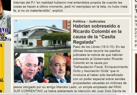 Provinciales | Corrientes (19-3-15): Lo anticipado por SUR CORRENTINO en el día de ayer y adelantado ya en diciembre del pasado año sobre el sobreseimiento de Ricardo Colombi en la causa en que estaba imputado sobre "Def...