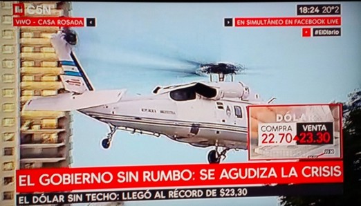 Nacionales | Bs. As. (4-5-18): La Casa de Gobierno tuvo una jornada muy complicada por la disparada del dólar, que superó los 23 pesos. La partida del presidente en helicóptero trajo al recuerdo la imagen del 2001. Par...