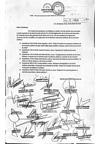 Nacionales | Bs. As. (18-4-18): El bloque de Diputados y Diputadas nacionales FPV-PJ, junto a otras fuerzas políticas opositoras al gobierno de Mauricio Macri, presentaron hoy la solicitud de sesión especial para este ...