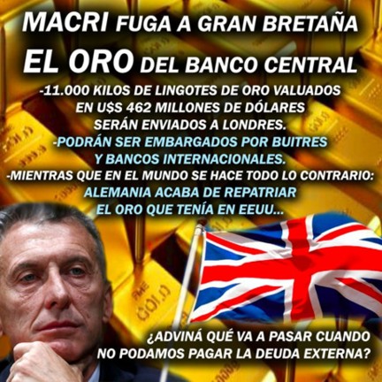 Nacionales | Bs. As. (26-9-17): En una polémica maniobra, el Gobierno argentino enviará a Londres lingotes de oro de reservas del Banco Central por una suma de 462 millones de dólares, para enviarlas a Londres y que la...
